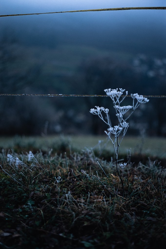 99/366 If not for its covering of frost I surely would have overlooked this little guy, but I am sure glad that I didn’t. With the dark greens and browns at the bottom of the image and blues at the top, it reminds me of a world in miniature.