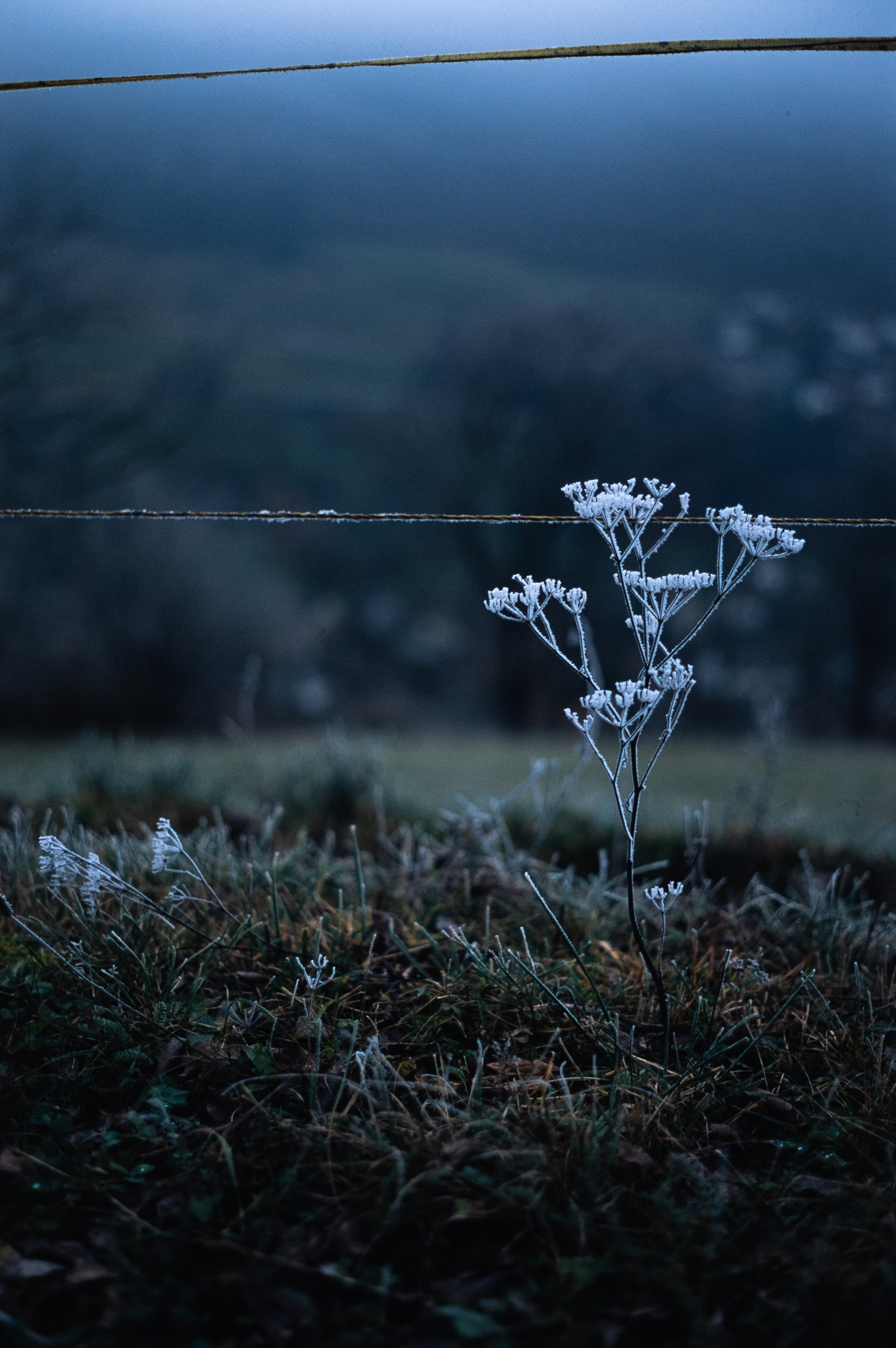 99/366 If not for its covering of frost I surely would have overlooked this little guy, but I am sure glad that I didn’t. With the dark greens and browns at the bottom of the image and blues at the top, it reminds me of a world in miniature.