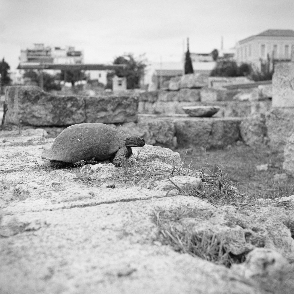 121/366 Greece was full of surprises for us, mostly very nice ones in fact and it humbled me to find out how little I actually knew about the country. One such time was when we started to wander through one of the historical sites – the Archaeological Site of Kerameikos and saw a turtle. Our immediate reaction was that someone had set their pet free. After coming across the second, third and dozenth, we realised that this clearly wasn’t the case. We left them to their own devices and just enjoyed watching them plod along on their grand adventures. I made a few photos of them, but I like this one the most – it almost appears as if the turtle is surveying its domain from on high.