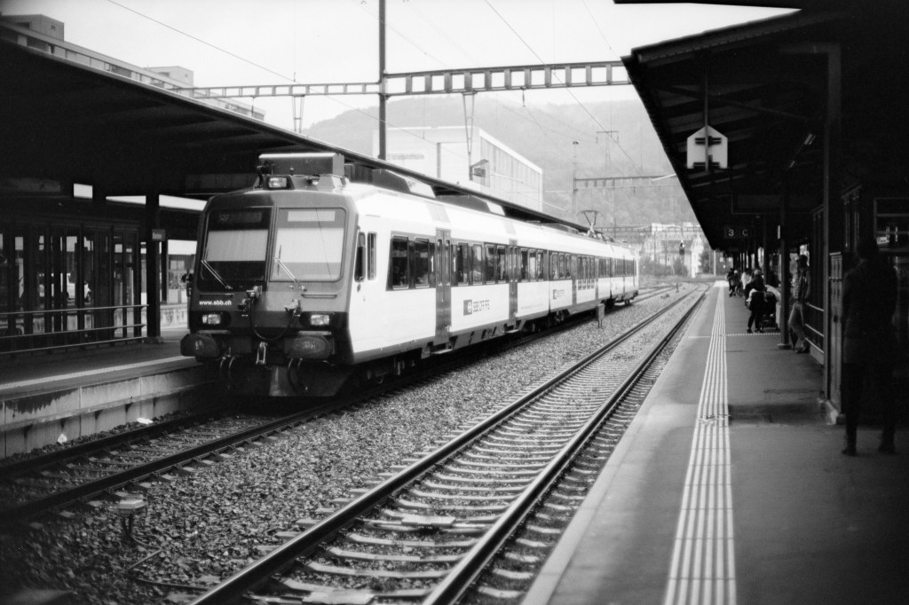 254/366 Where I once was repulsed by the optical imperfections of vintage lenses, I now enjoy using them in my film photography to get away from the ultra perfect rendition of modern digital cameras and lenses. Here at the train station in Baden the glow on the side of the train helps to visually pull it forward, increasing the 3D-ness of the image.