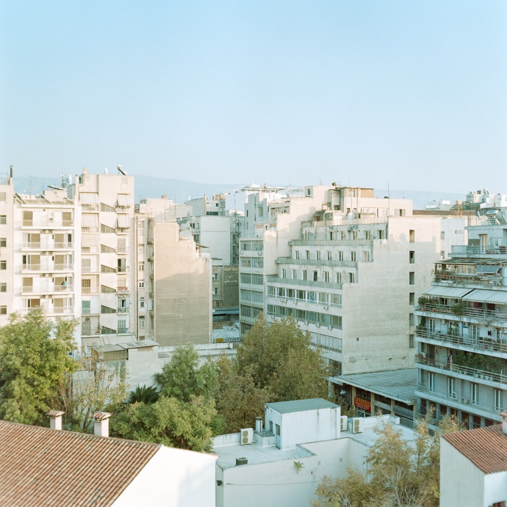 296/366 There is a romanticism to film and film photography that can make even pedestrian scenes seem beautiful. Here I photographed a haphazard collection of apartment buildings under the setting sun, nothing out of the ordinary for Athens I’m sure, but the result definitely has a romantic vibe. I can’t help but think about the lives lived and loves loved in these apartments, all through rose coloured glasses.